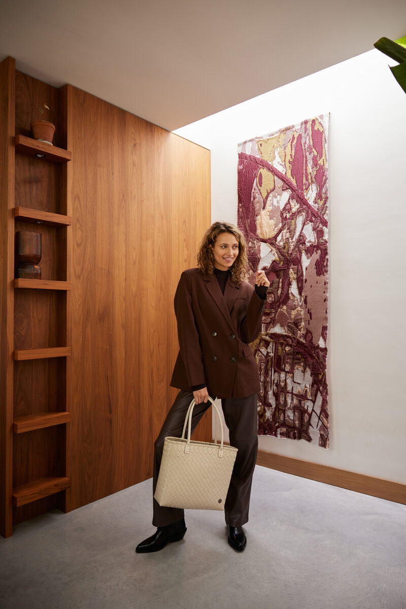 The ‘CHLOÉ’ is the perfect bag for those looking for a versatile mid-size option: large enough to use as a shopper, yet compact enough to carry as a handbag. Its distinctive features include a diagonal weave pattern and solid-coloured handles, which together create a calm, minimalist look. The bag is handwoven from recycled plastic and finished with sturdy PU leather handles that are comfortable to carry by hand or over the shoulder.