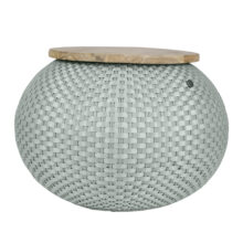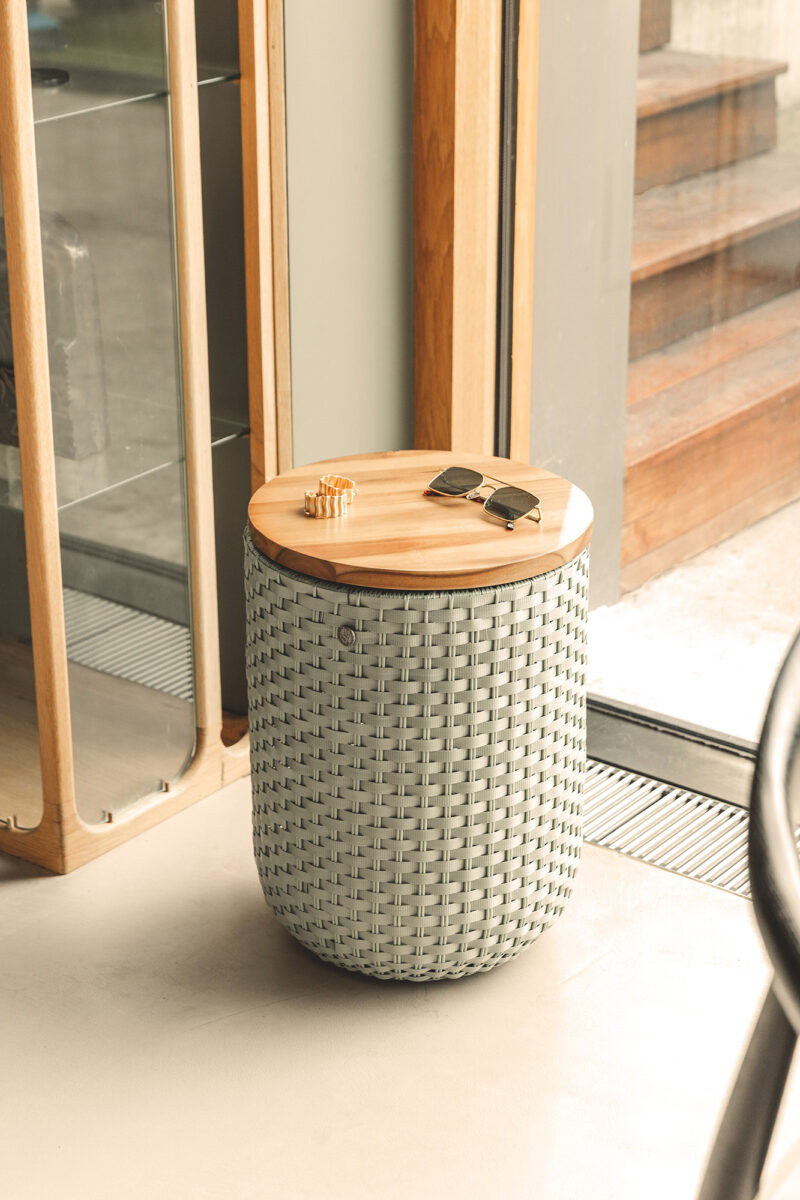 The Halo is a handwoven sidetable of Handed By. A storage basket, sidetable and pouf in one! Multifunctional! There’s a hidden storage place under the wooden plateau. Perfect for your toys, remote control or pens. Unexpectedly a lot of visitors and too few chairs? Use it as a seat! Handwoven and made of recycled plastic. Available in various colours.