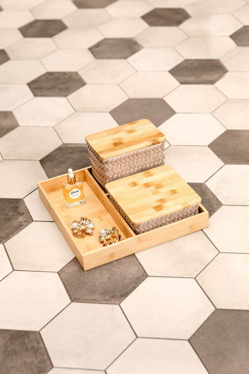 Bring order to chaos with our ORGANIZE (F)IT ! This stylish bamboo tray comes with two hand-woven baskets with lids. Ideal for storing cotton wool and accessories in the bathroom, or coffee and tea supplies in the kitchen, or to keep your workspace organised and trendy. Use the extra space on the tray to display your coffee cups and tea mugs nicely. Available in different colours. The baskets are made of recycled plastic and the bamboo lids make them easy to close.